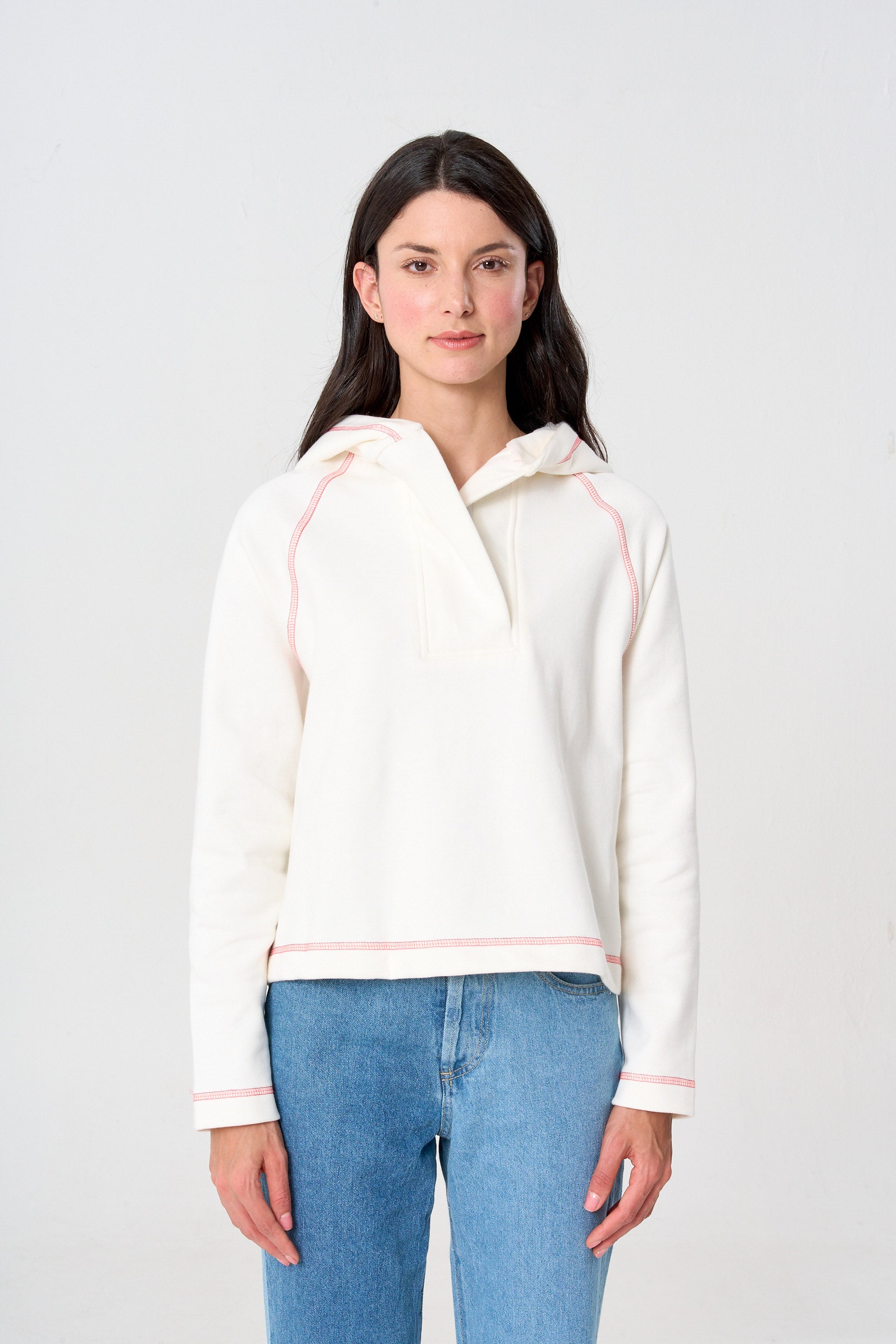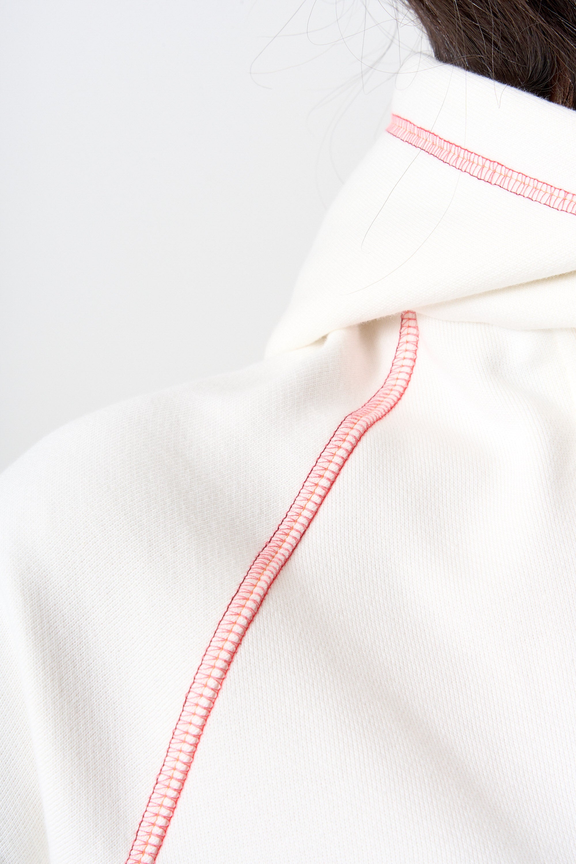 Buso blanco con costuras decorativas en gama de rosados. Es suave por dentro y con horma oversized, muy cómodo y versátil. Composición 100% algodón.