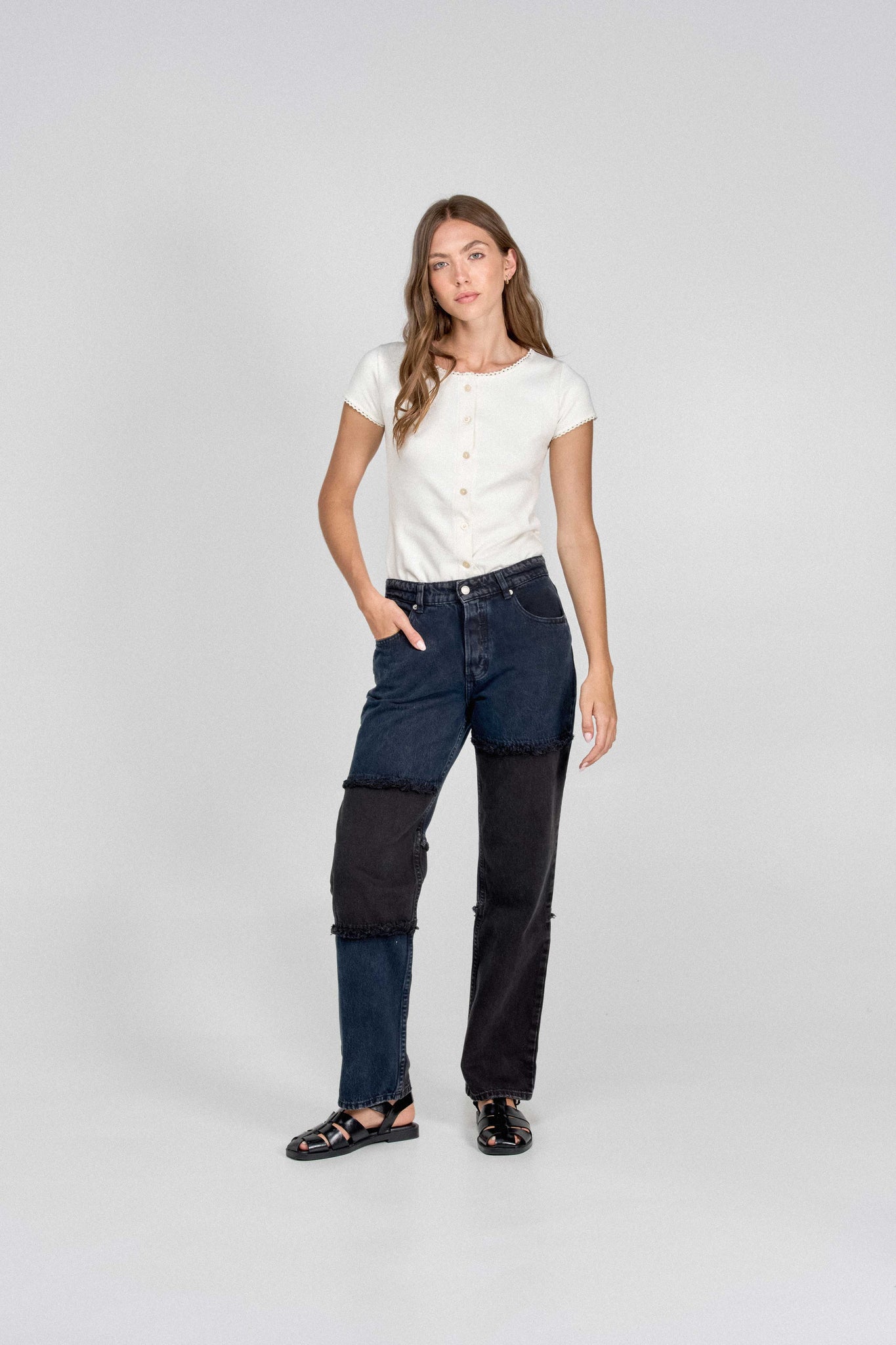 Straight jean con técnica patch work en denim oscuro. Composición 100% algodón. Método de cierre: botones.