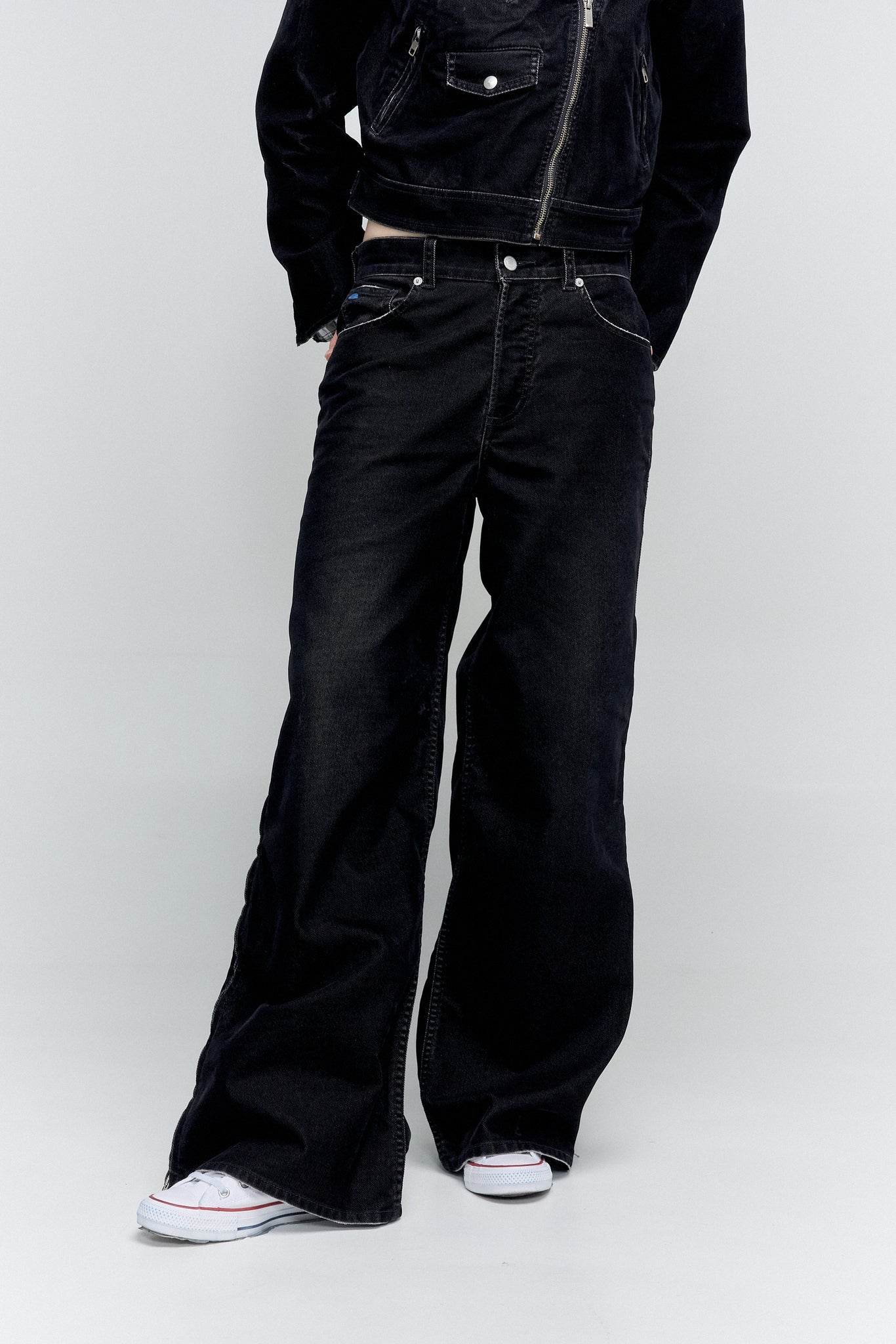 Flare jean en denim con textura de terciopelo negro y cierre en los costados. Puedes usarlo con el cierre abierto o cerrado. Composición 100% algodón. Método de cierre: cremallera.