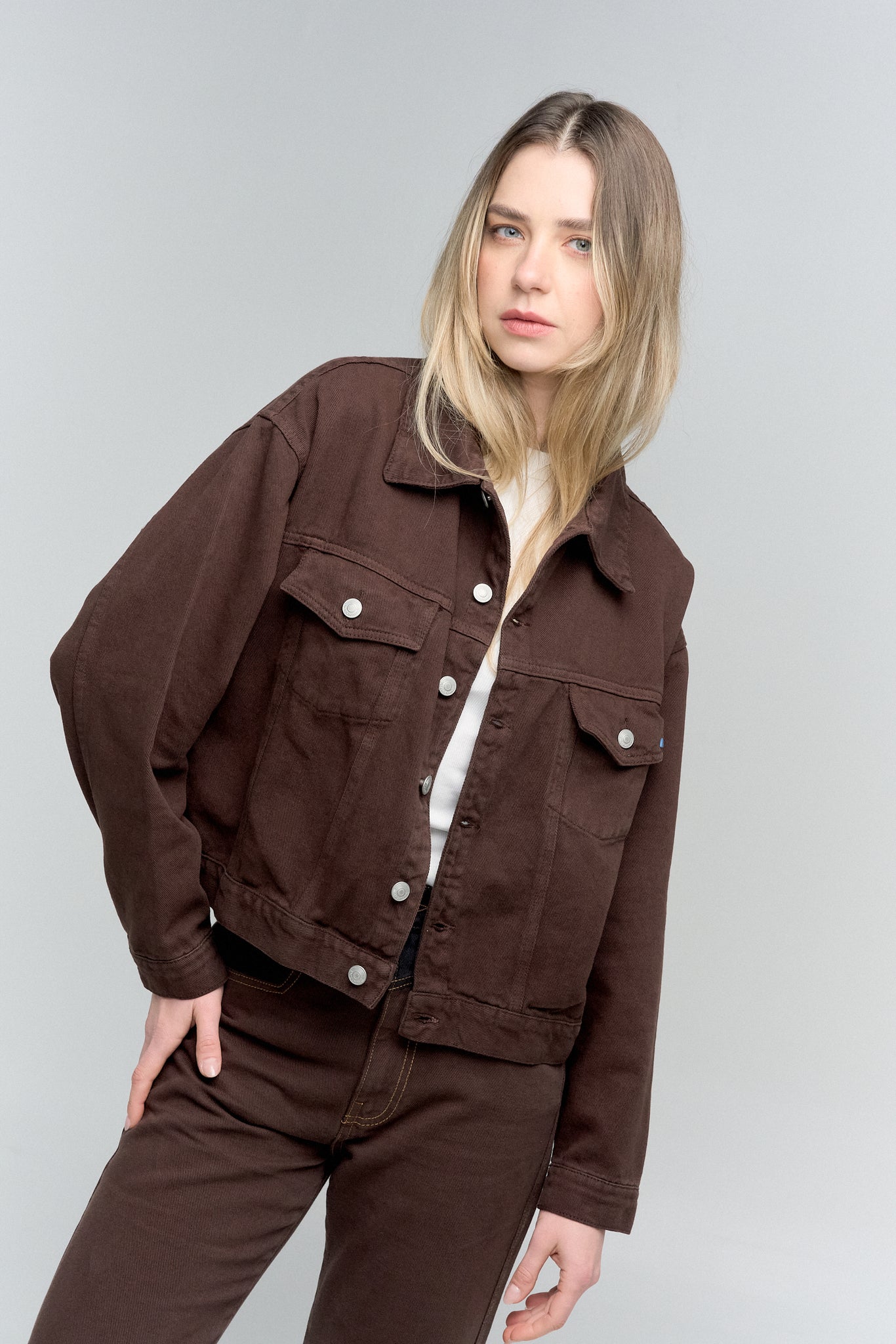 Chaqueta y jean straight en denim café con corte azul. Composición 100% algodón. Método de cierre: cremallera para el jean y la chaqueta botones.