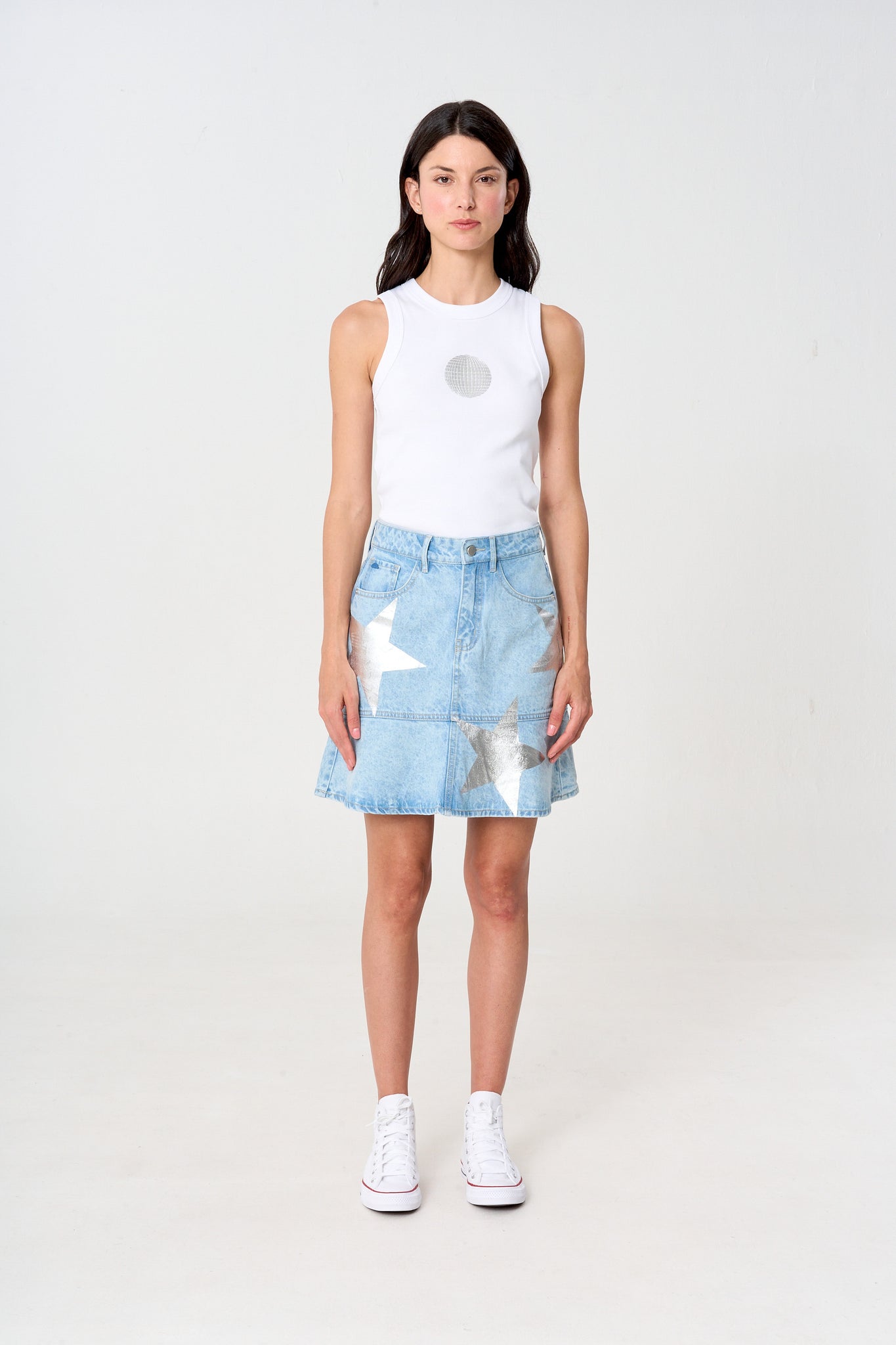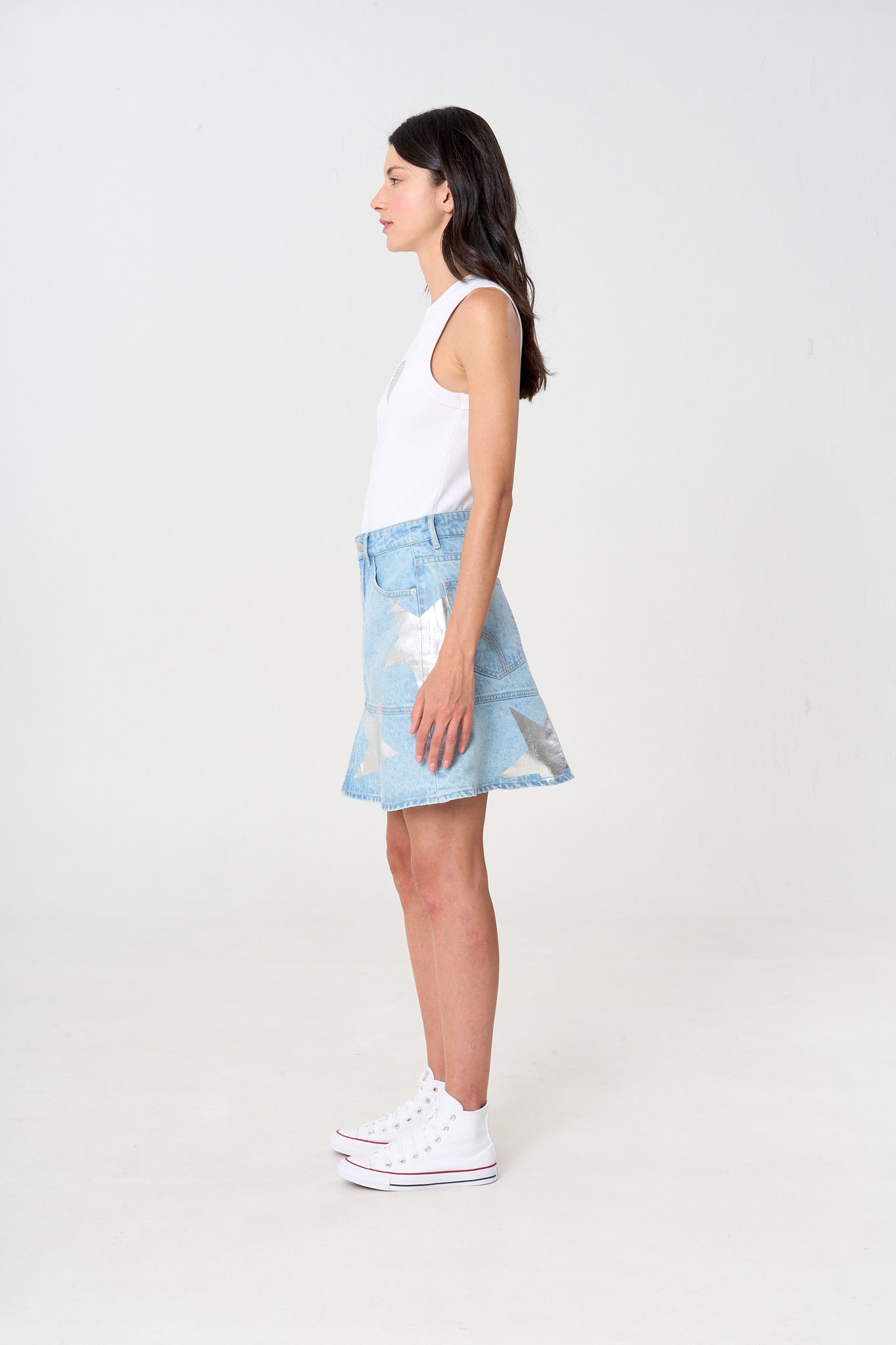 Falda tono medio con estrellas hechas a mano en foil plateado. El método de cierre es cremallera. Composición 100% algodón.