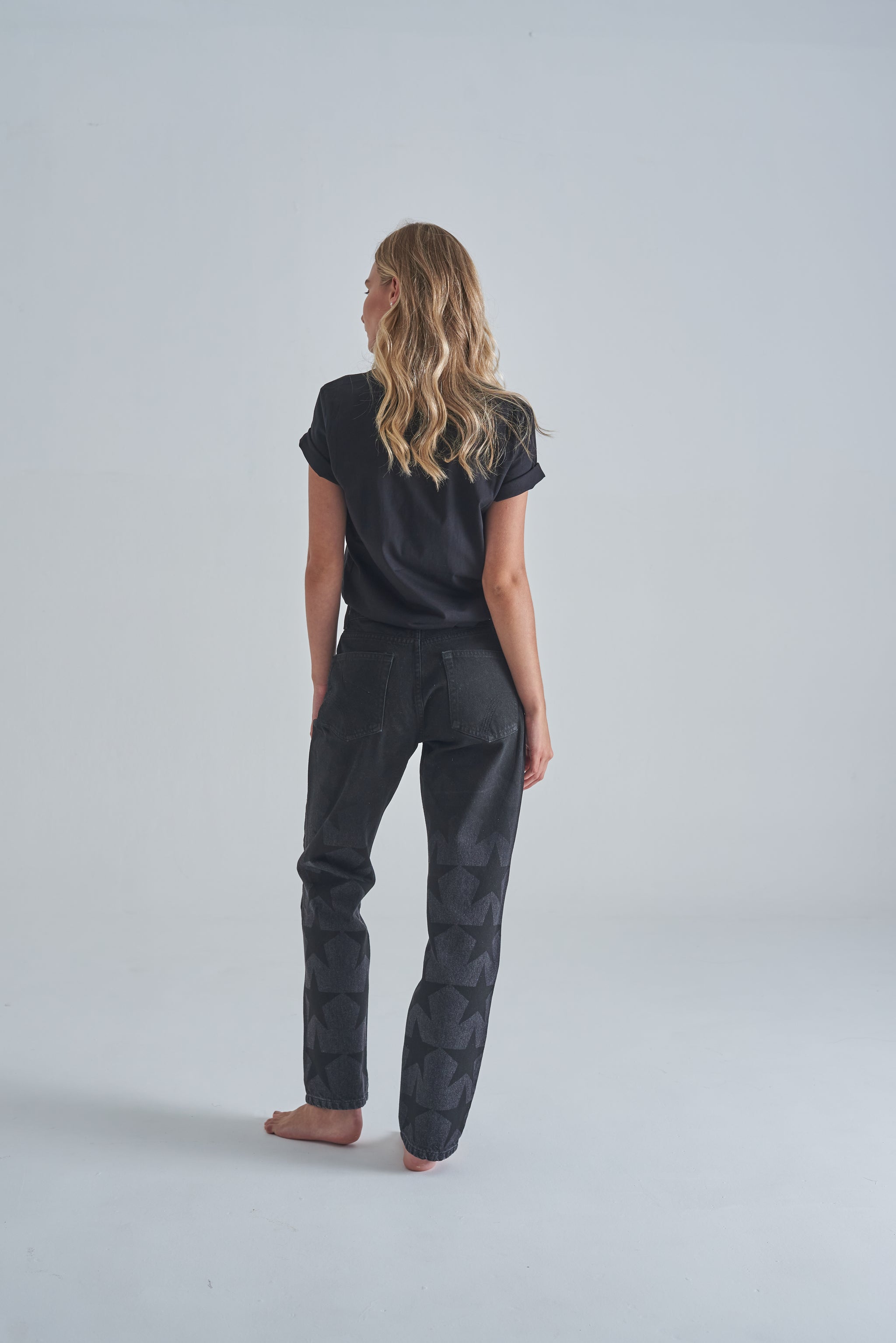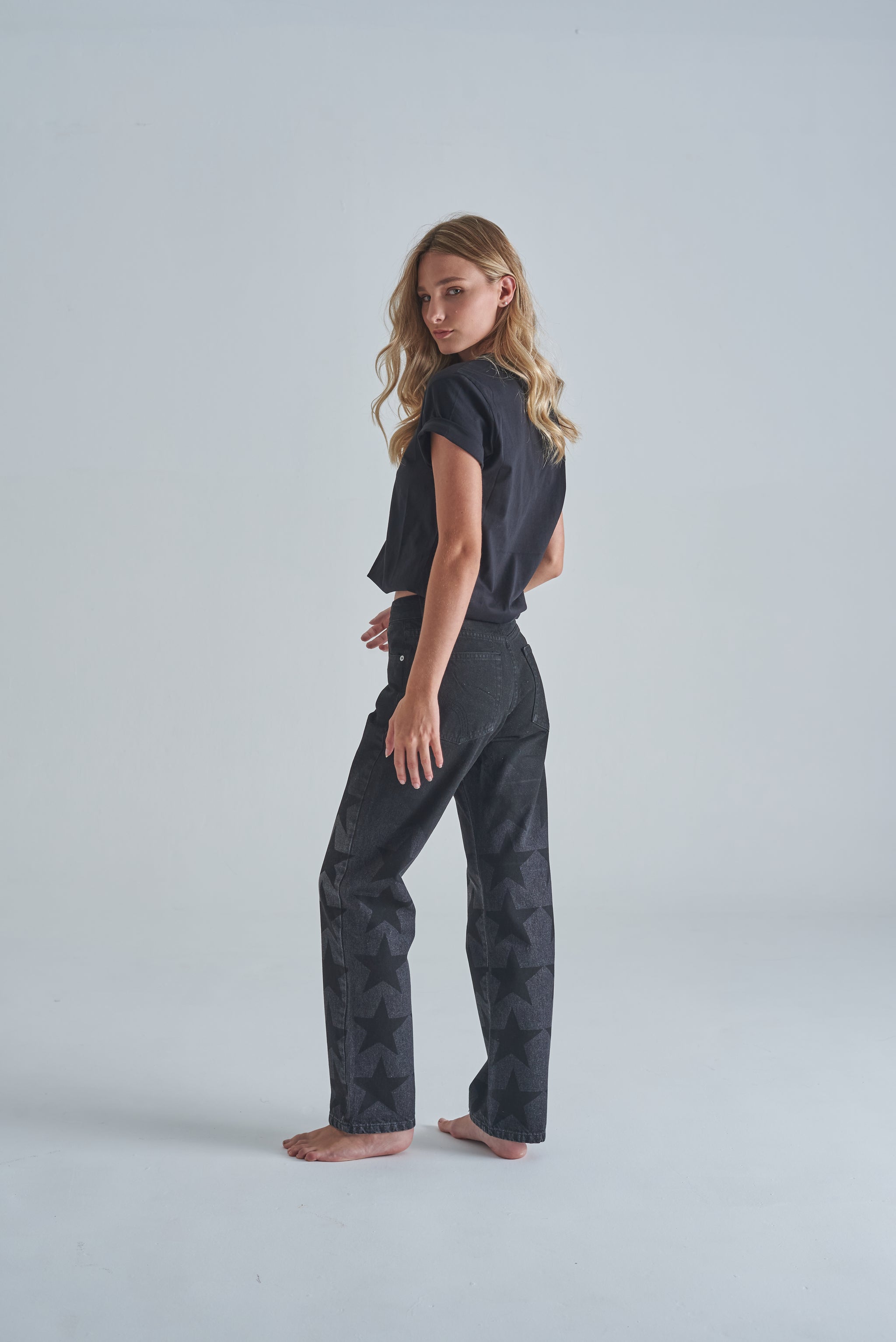 Straight jean con degradé negro con estrellas estampadas. El método de cierre es botones. Composición 100% algodón.