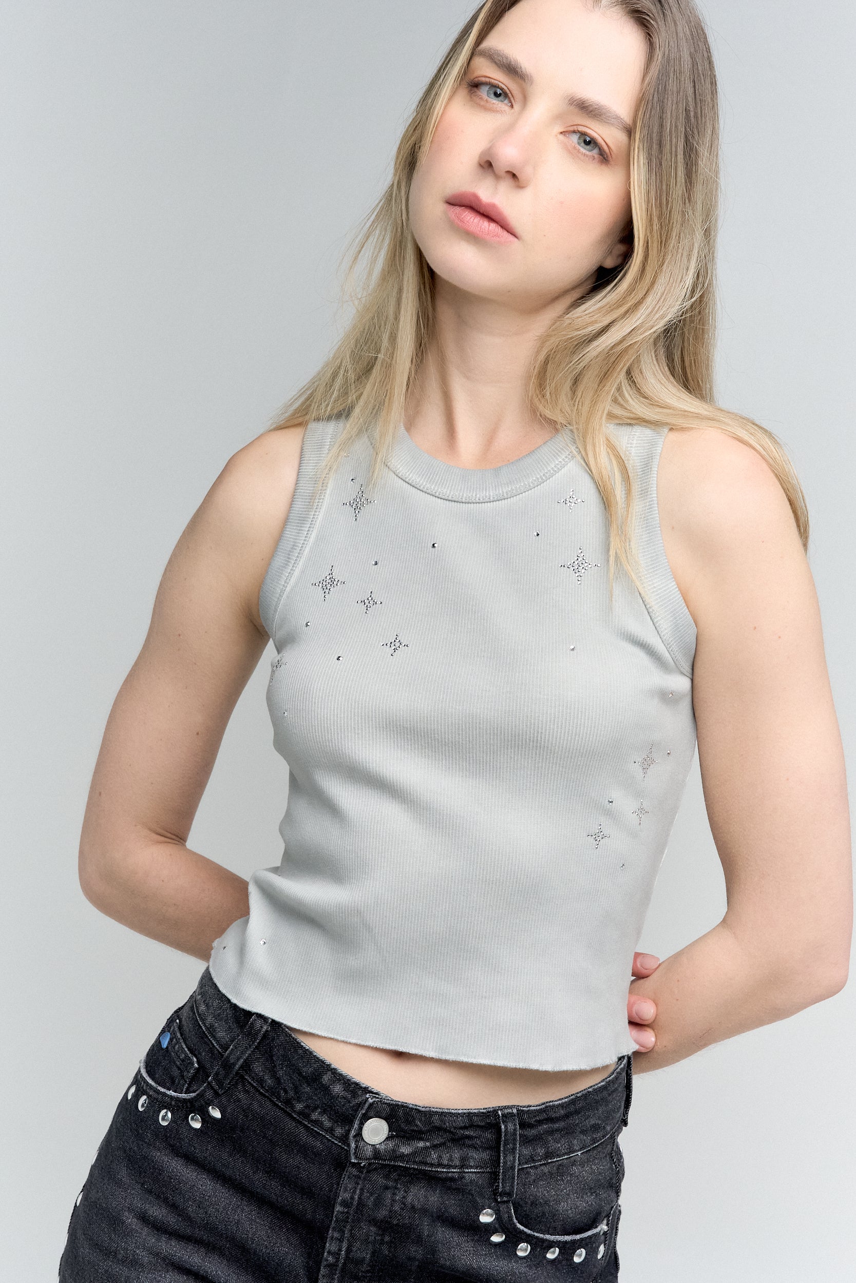 Tanktop gris con proceso desgastado y apliques de cristales por toda la prenda.