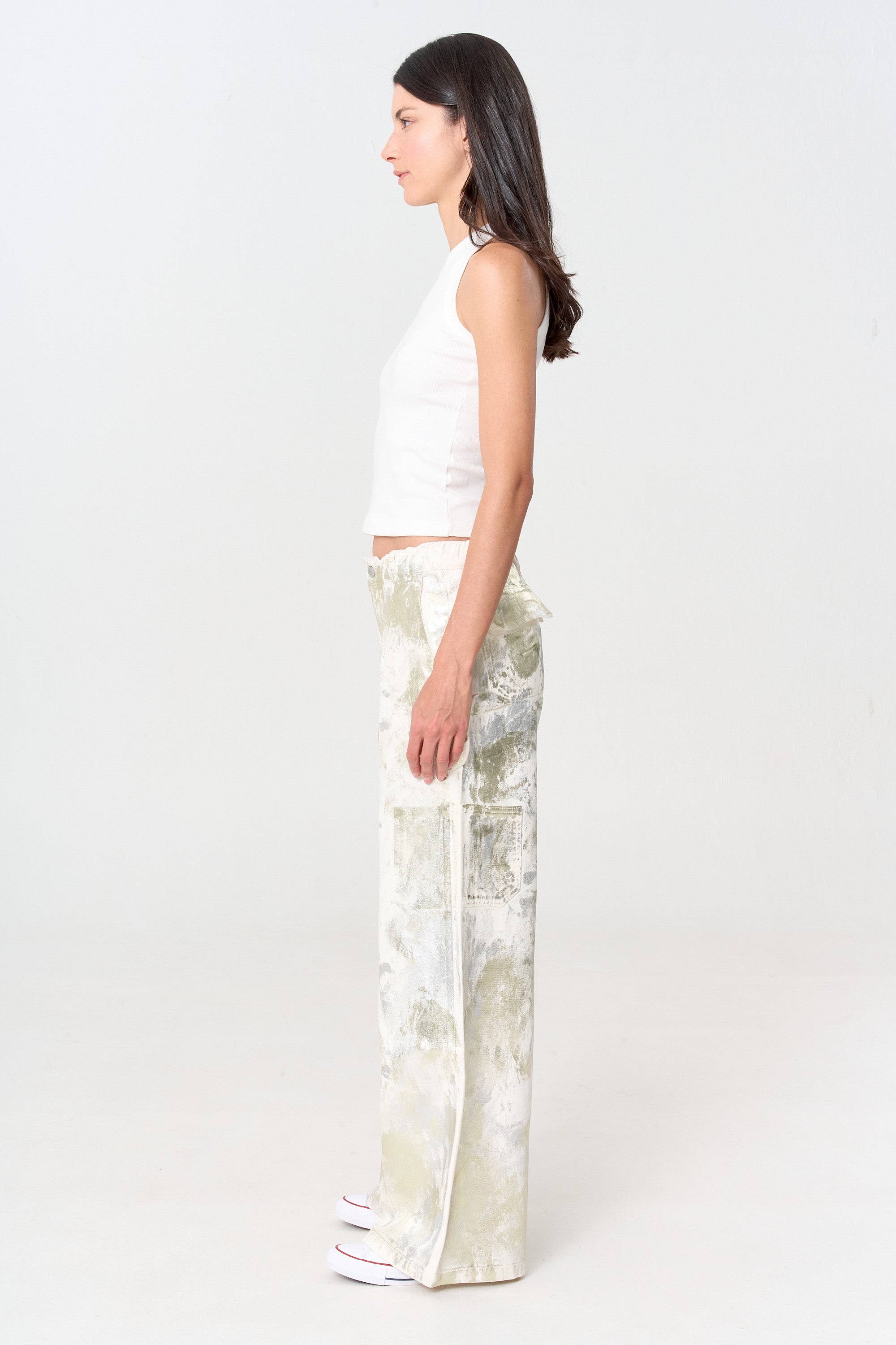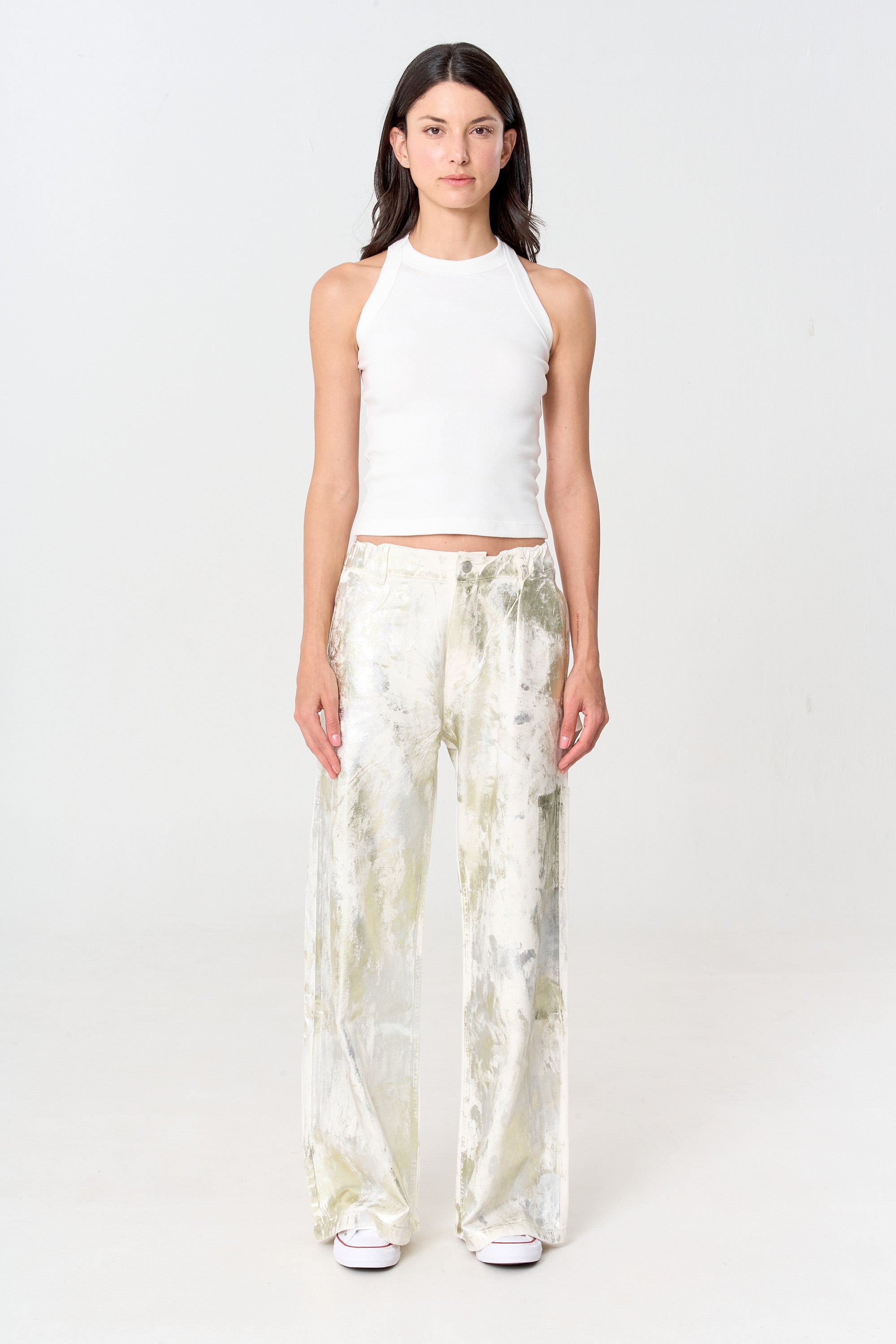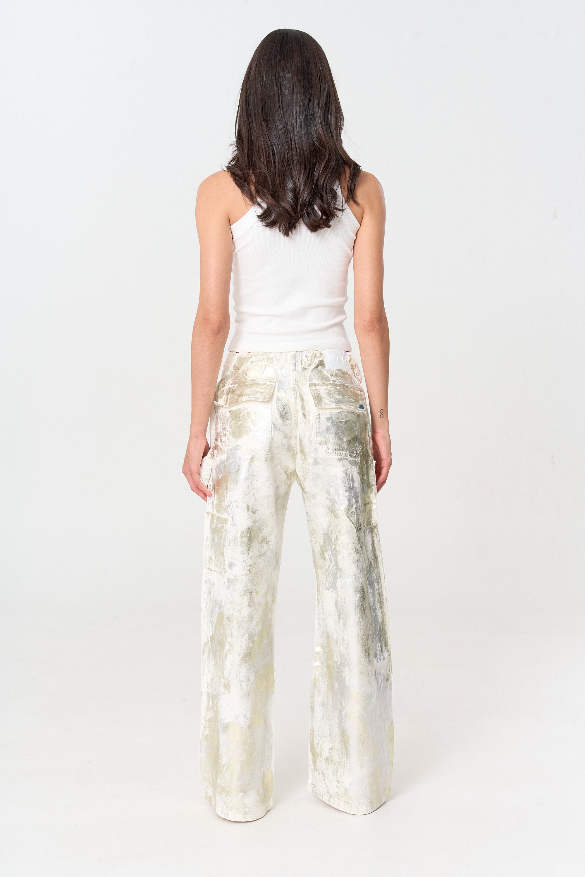 Carpenter jean blanco con foil irregular plateado y champaña. El método de cierre es cremallera. Composición 100% algodón.