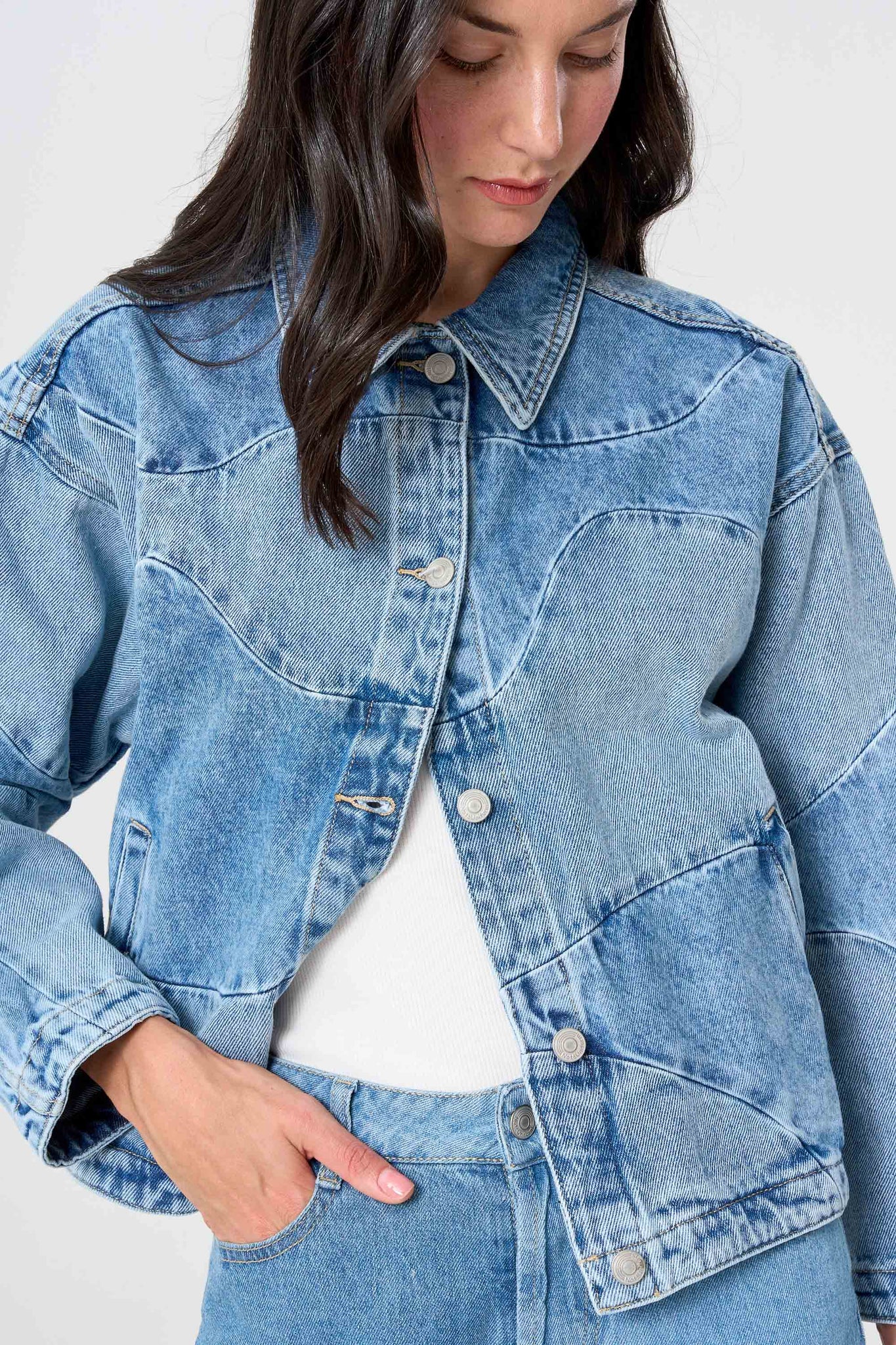Chaqueta tono medio. Los cortes de esta chaqueta resaltan la diferencia de los dos tonos que tiene, claro y medio. El método de cierre es botones. Composición 100% algodón.