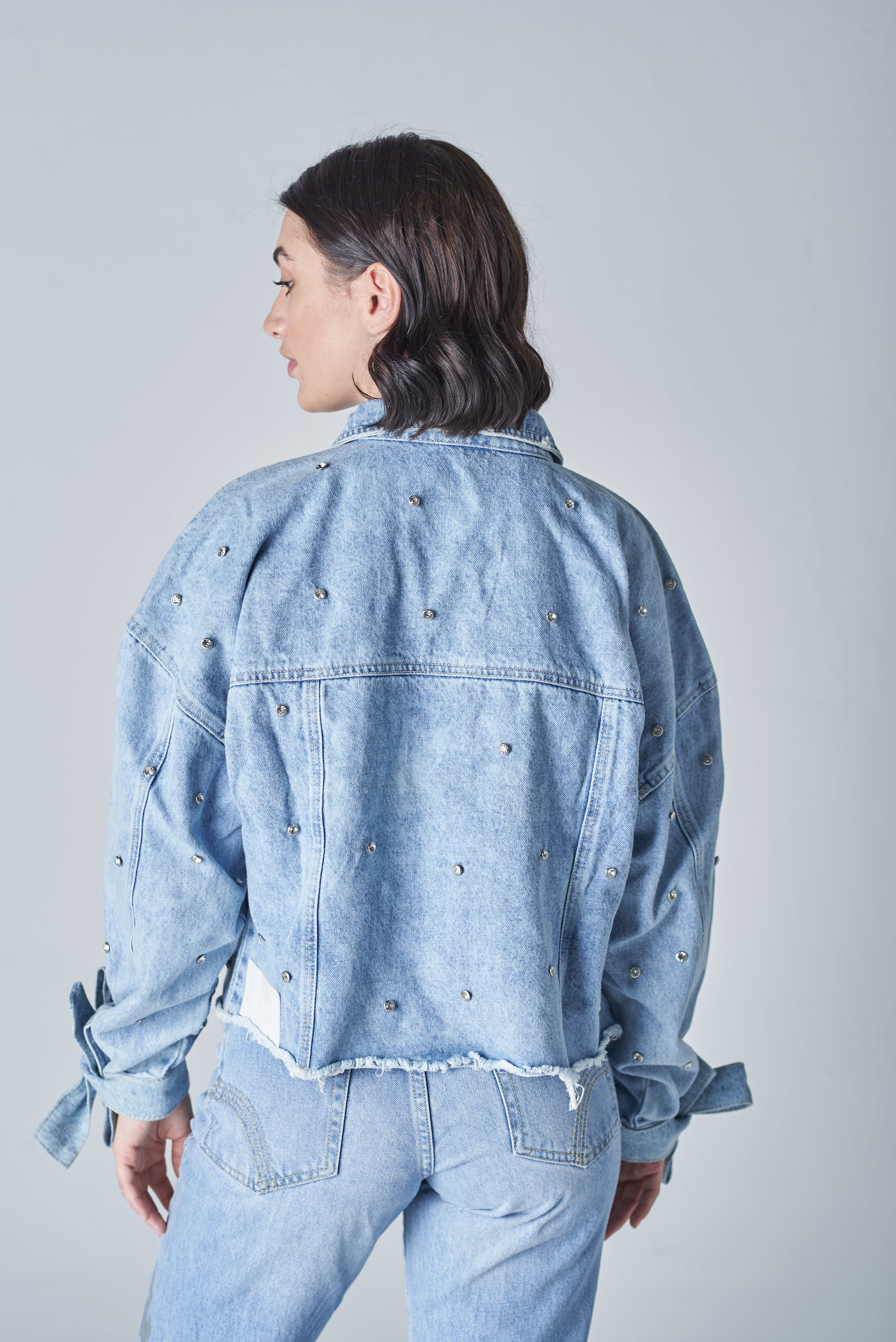Chaqueta Denim tono claro, cropped oversized con taches brillantes y moños en los puños. Composición 100% algodón. método de cierre con botones.